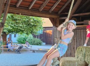 Natürlich sind auch noch Rutschen und ein Schwingseil eingebaut, um dem ganzen Bewegungsdrang, der in unseren Kinder steckt, freien Lauf zu lassen.